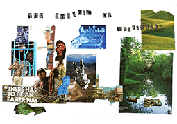 “There are images of being trapped. The blue drawing is of a social situation, which I find difficult. The boats on the river in Venice are half way between the negative and the positive. The text reads ‘in pursuit of happiness’, which is represented by the garden on the right side”.