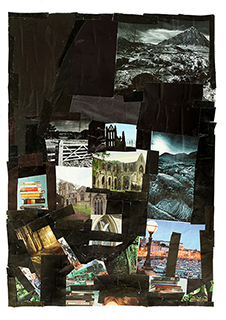 “This here, at the bottom, represents my mind. Its just the top of someone’s head. And all this blackness is what’s all around at the moment. The depression. I start with very bad panic attacks and anxiety attacks and then the depression comes in. I start being listless and I can’t take an interest in things. All these things like the two people digging here – I used to go on archeological digs, which I really enjoyed. Trains. I tried to find a picture of a station, but I couldn’t – the infrastructure of railways is another interest of mine. Churches. I like walking in woods and books are a great passion. So that’s all those things, and all this here is just the blackness, the bleakness. A bleak landscape and ruins. Its all overloaded with blackness”.